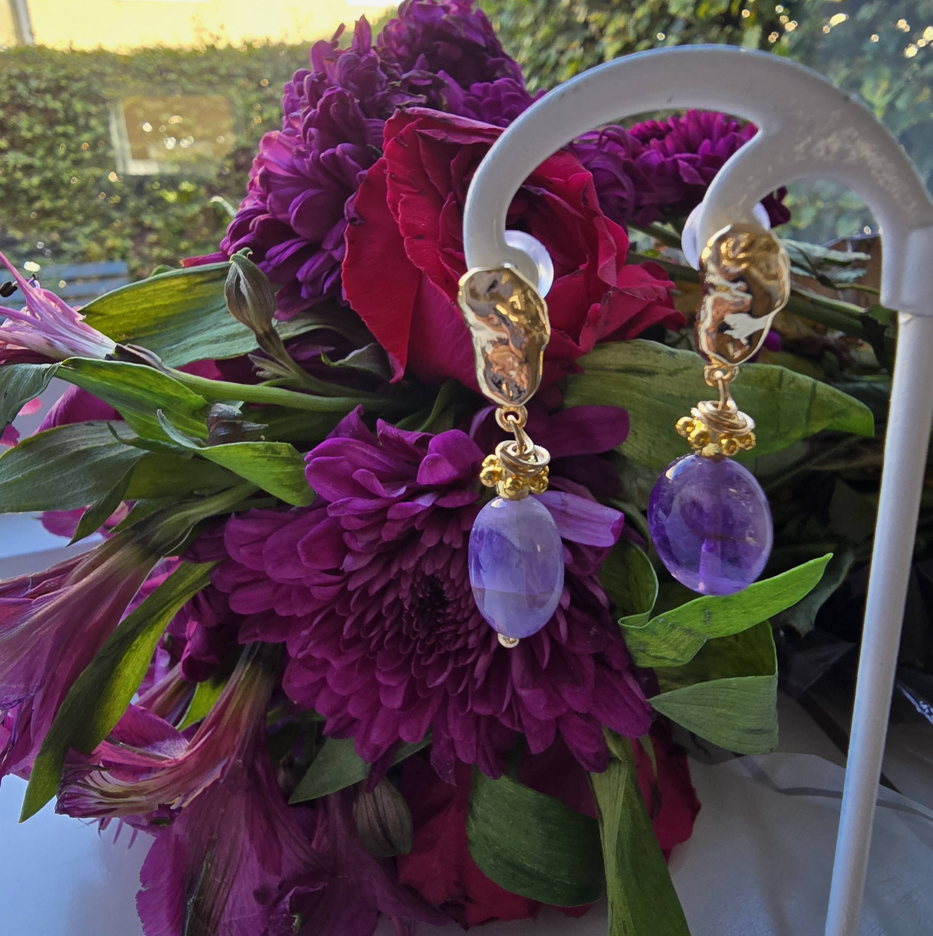 Øreringe med blå dråbe og stor forgyldt banket ørekrog måler 4.cm.