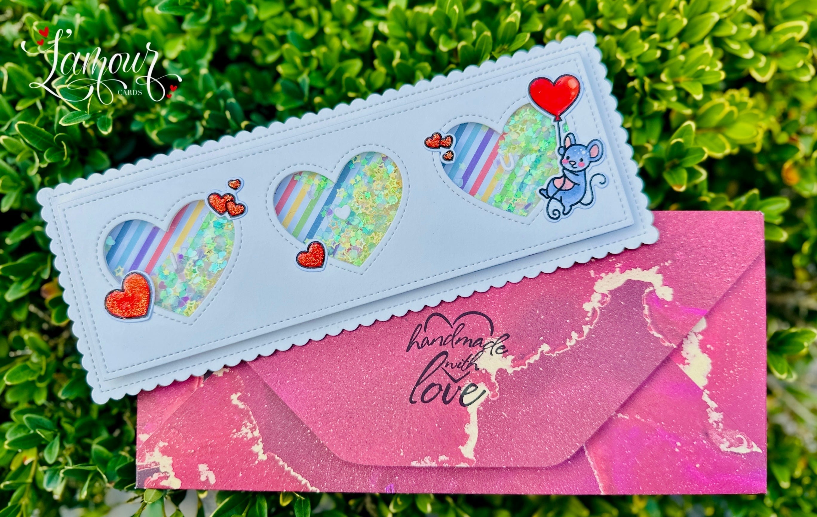 Unique shaker card design – Each heart window is filled with playful shaker bits for an interactive and eye-catching effect.