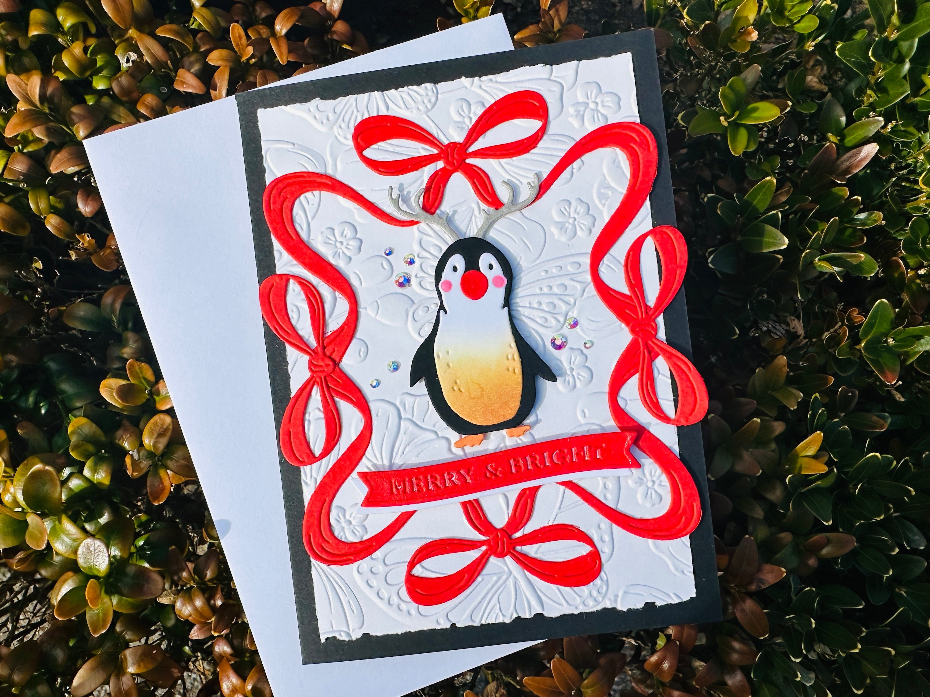 Add a touch of whimsy to your holiday greetings with these charming penguin cards. Each design features a sweet little penguin framed by festive bows in bold red or teal, with embossed backgrounds that add texture and detail. Accented with sparkling gems and cheerful holiday messages like “Wishing You a Very Merry Christmas” and “Merry & Bright,” these cards are full of personality and joy.