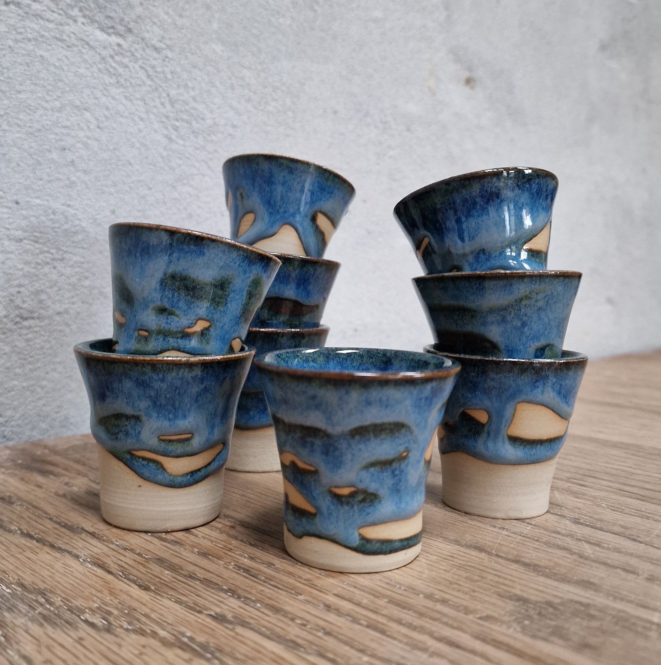 Et krus, hvor der er arbejdet med forskellige glasurer der blander sig og som skaber et unikt udtryk.